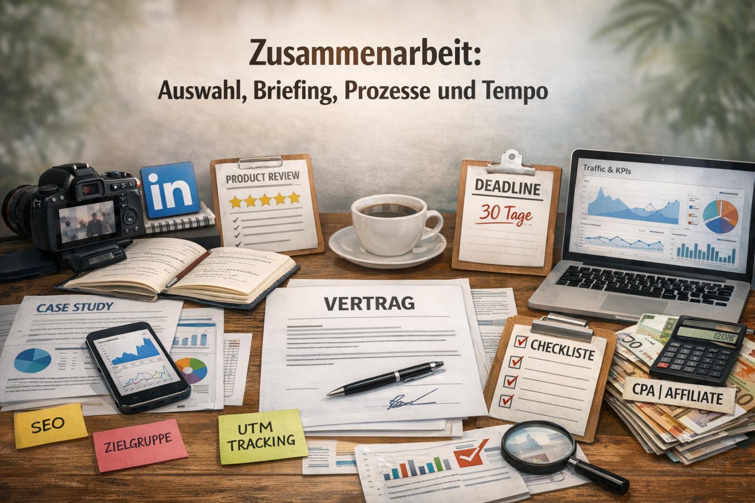 Wähle Blogger nicht nach Reichweite allein, sondern nach Passung: thematische Expertise, Tonalität, Audience-Demografie und Beispielarbeiten. Für ein B2B‑SaaS-Produkt sind detaillierte Case Studies mit Zahlen und LinkedIn-Engagement relevanter als Lifestyle‑Reichweite; für ein D2C‑Produkt zählt hingegen Produkt-Review‑Authentizität. Klare Vertragskonditionen regeln Bezahlung, Nutzungsrechte, Laufzeit und mögliche Exklusivität (z. B. 4 Wochen keine Konkurrenzlinks). Entscheide zwischen Fixhonorar, CPA oder Affiliate je nach Ziel: Brandbuilding per Fixzahlung, Performance‑Fokus per CPA/Affiliate.