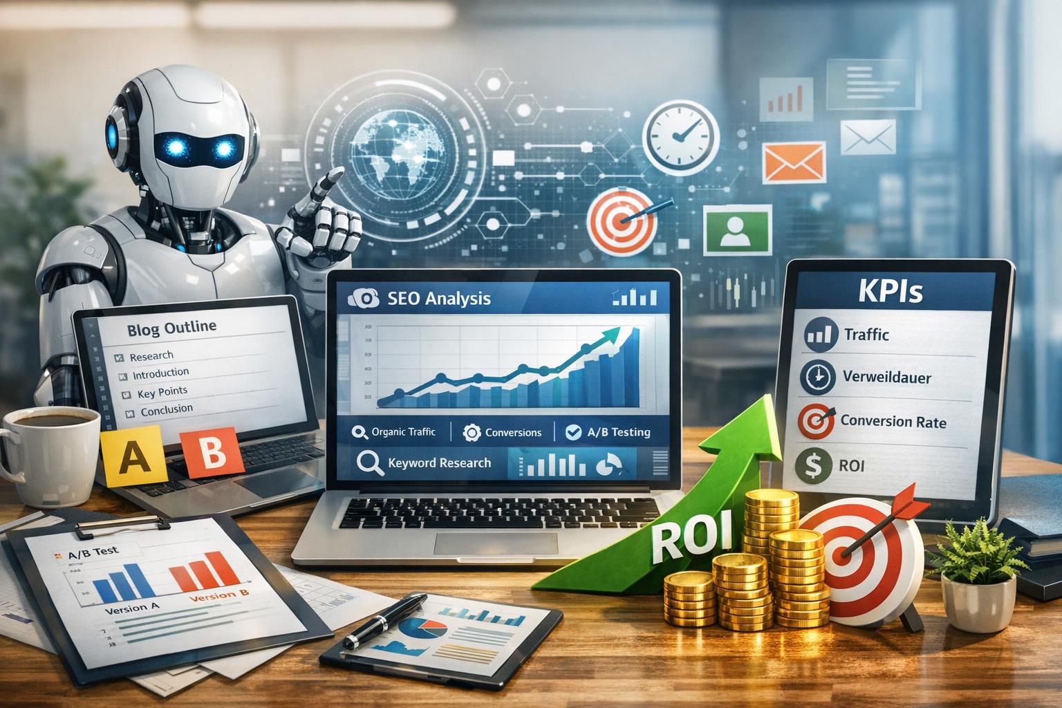 • Konkrete Einsatzpunkte: Ideen & Priorisierung, Gliederung & Entwurf, SEO & Finalisierung; klare KPIs wie Produktivität, Lesbarkeit, organischer Traffic, Conversions und Qualität.
