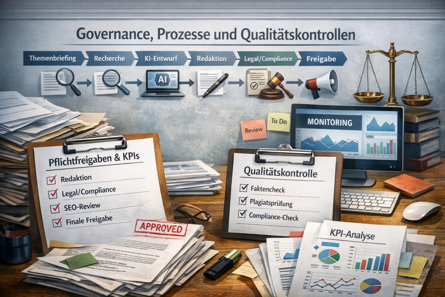 Definiere eine klare Redaktionspipeline: Themenbriefing → KI-gestützte Recherche → Entwurf → redaktionelle Überarbeitung → rechtliche Prüfung → Freigabe → Publishing. Ordne jeder Stufe eine Rollenbeschreibung zu (Autor/in, KI-Operator/in, Redakteur/in, Legal, Publisher) sowie Entscheidungskriterien: wer darf Änderungen an Headline, Daten oder rechtlich sensiblen Passagen vornehmen. Nutze Versionsmanagement (z. B. Git- oder CMS-Versionen) und ein Änderungslog, damit sich jede KI-Generierung rückverfolgen lässt. Beispiel: Ein Redakteur markiert „KI-enthaltene Abschnitte“ im CMS und dokumentiert Quelle + Prompt im Änderungslog.