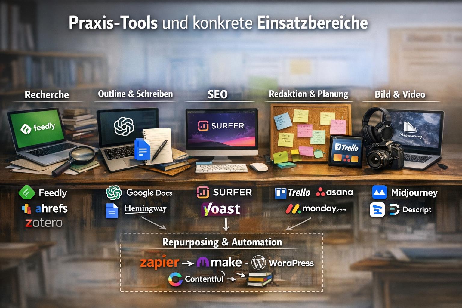 Du ordnest Tools nach Funktion, nicht nach Hype: Recherche-Cluster (z. B. Ahrefs, Semrush, Google Trends), Outline- und Schreibassistenz (ChatGPT, Claude, Jasper, Writer), SEO-Tools (SurferSEO, Clearscope, RankMath), Redaktionsplanung (Notion, Asana, Trello, Contentful), Bild-/Video-Generierung (Canva Pro, Midjourney, Stable Diffusion, Runway, Descript) und Content-Repurposing (Repurpose.io, Pictory, Descript). Beispiel: Nutze Ahrefs für Keyword-Cluster, ChatGPT für Roh-Outline, SurferSEO zur On-Page-Optimierung, Notion für Aufgaben und Freigaben, Canva/Runway für Visuals.