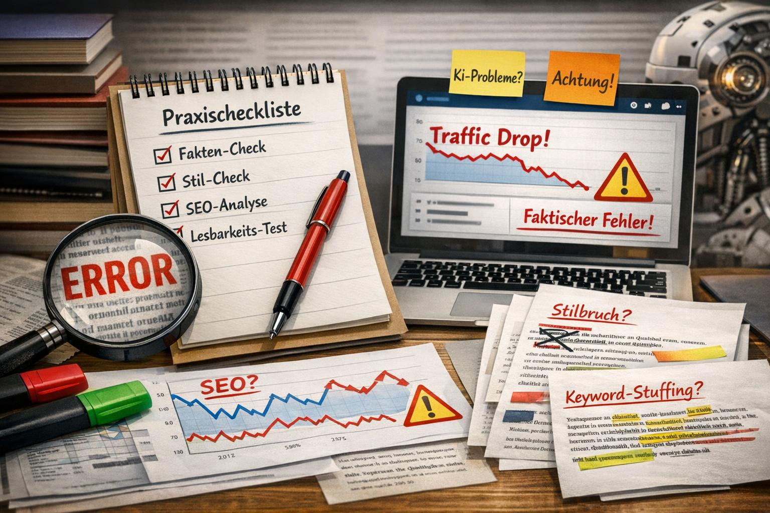 Achte auf typische Fehlannahmen: KI macht Inhalte nicht automatisch besser, Quantität darf nicht Qualität ersetzen, und unkritische Übernahme von Modell‑Daten kann falsche oder rechtlich problematische Informationen verbreiten. Implementiere daher Redaktionschecks, Faktenprüfung und eine Metrik zur Qualitätsbewertung, bevor du skalierst.